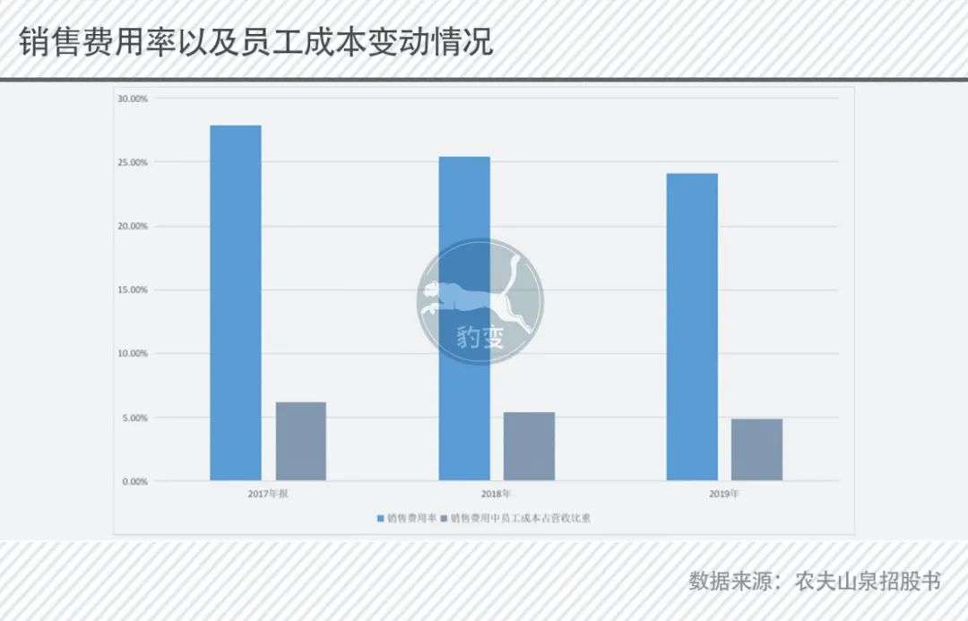 农夫山泉甚至把自己的销售人员纳入经销商的人员编制里,让经销商给销售人员发工资。所以在招股书上,销售费用率还呈现下降趋势。