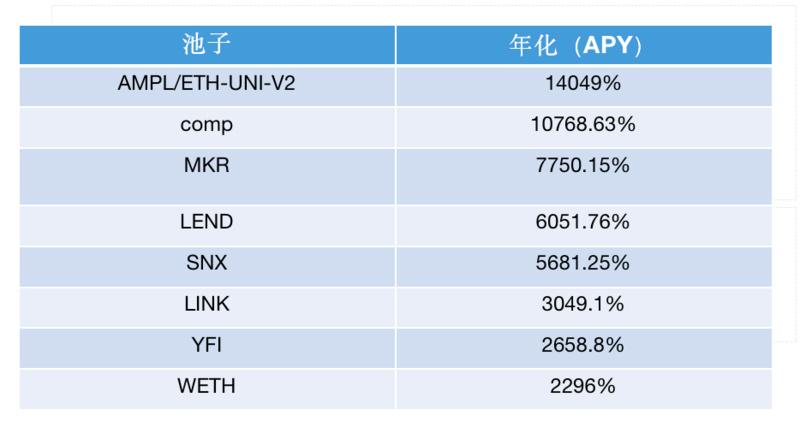 根据 Twitter 大 V weeb的计算,最高的 APML 池每小时 ROI 可达 1.6%,年收益高达 14049%,表现最差的池子为 WETH 池子,每小时 ROI 为 0.263%,年收益为 2296%。