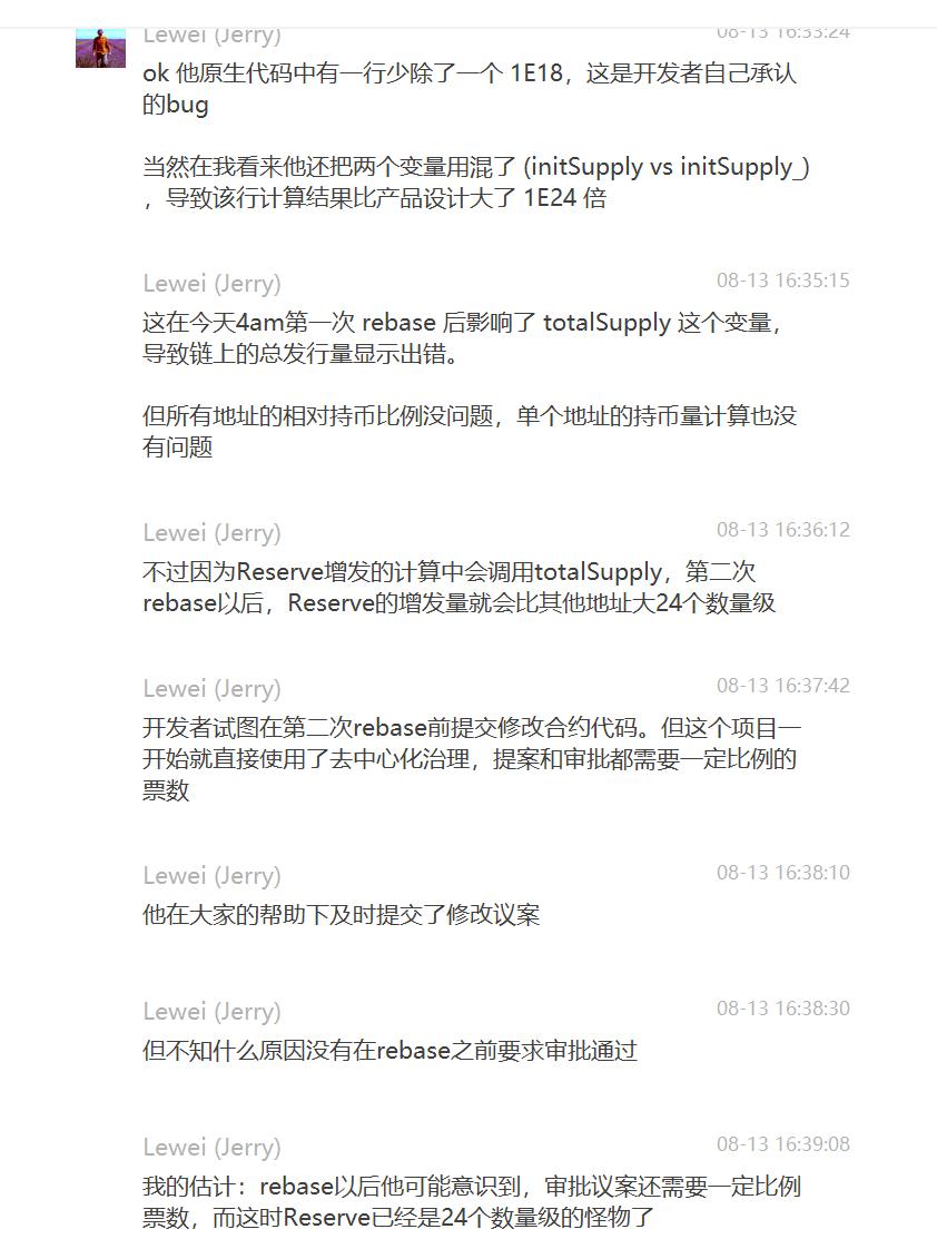 慢雾安全团队表示,由于编码不规范,YAM 合约在调整 totalSupply 的时候,本应将最后的结果除以 BASE 变量,但是在实际开发过程中却忽略了,导致 totoalSupply 计算不正确,比原来的值要大 10^18 倍。