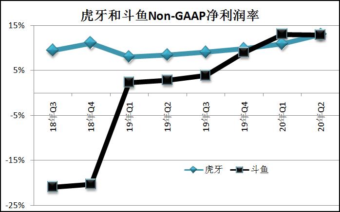 但让人惊奇的是,虎牙的盈利一直稳健,大部分时间Non-GAAP优于斗鱼,Q2虎牙是13%,斗鱼是12.9%。这其实代表虎牙精细化的公会运营&MCN运营对斗鱼花大价钱抢优质主播模式的胜利(补充一个数据:虎牙和斗鱼的全网TOP1000主播占有率都在30%左右,优质主播层面也不虚)。