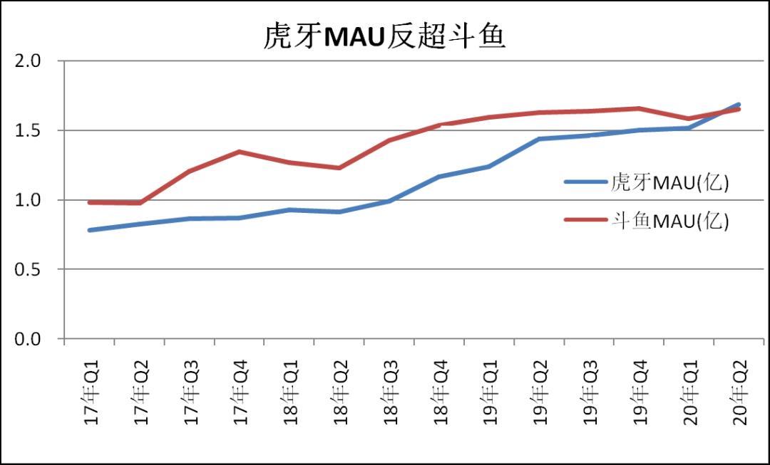 2020年Q2,虎牙MAU1.69亿,斗鱼MAU为1.65亿。