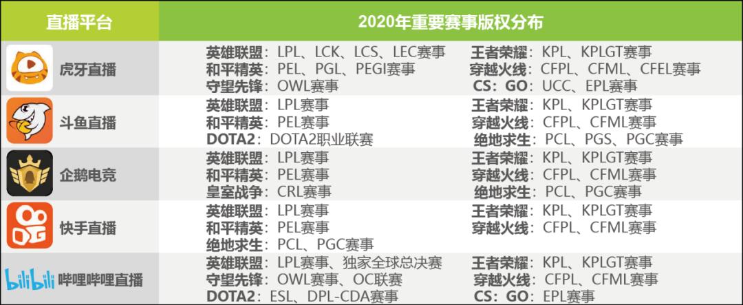 五大游戏直播平台(虎牙、斗鱼、企鹅电竞、快手直播、B站直播)的大热门,附带电竞项目的游戏有这些:《英雄联盟》、《王者荣耀》、《和平精英》、《绝地求生》、《穿越火线》、《守望先锋》、《CS:GO》、《DOTA2》——62.5%来自腾讯、12.5%暴雪、25%来自V社。