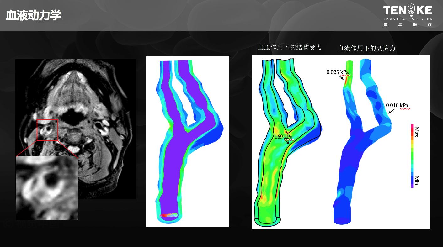 据沈逸凌介绍,血液动力学对斑块稳定性评估和中风、心梗预防有一定的价值。根据研究发现斑块周围的血液由于血压等因素会对斑块有扩张和挤压作用,在微观层面可导致平滑肌细胞迁移、凋亡或增生,使斑块内滋养血管破裂导致内出血,在宏观层面会导致斑块纤维帽破裂,使斑块变得不稳定,引入力学分析可对斑块或动脉瘤破裂风险预测提供重要新指标。