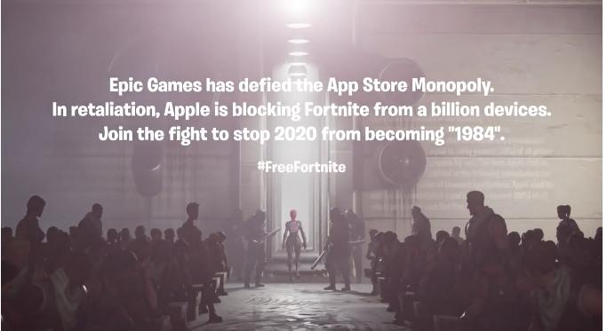 官方更发视频宣战:Epic Gams 拒绝苹果商店的统治。为了报复,苹果在数以亿计的手机上移除了《堡垒之夜》。跟我们一起战斗,避免2020年沦为乔治奥威尔笔下的1984。