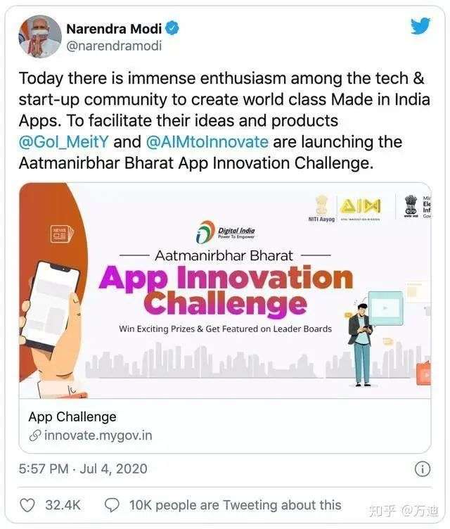7月4日,印度总理莫迪宣布启动一项名为“Atma Nirbhar Bharat”的创新项目,其含义是“印度自给自足”。其中,有一个名为“APP Innovation Challenge”,也就是“APP创新挑战”的分支项目,旨在鼓励印度本土科技公司和程序开发者进行在线社交、教育、娱乐、新闻和游戏等类型应用程序的创新和开发。从项目发布的时间点和内容来看,此举显然意在替代日前被封禁的中国APP。