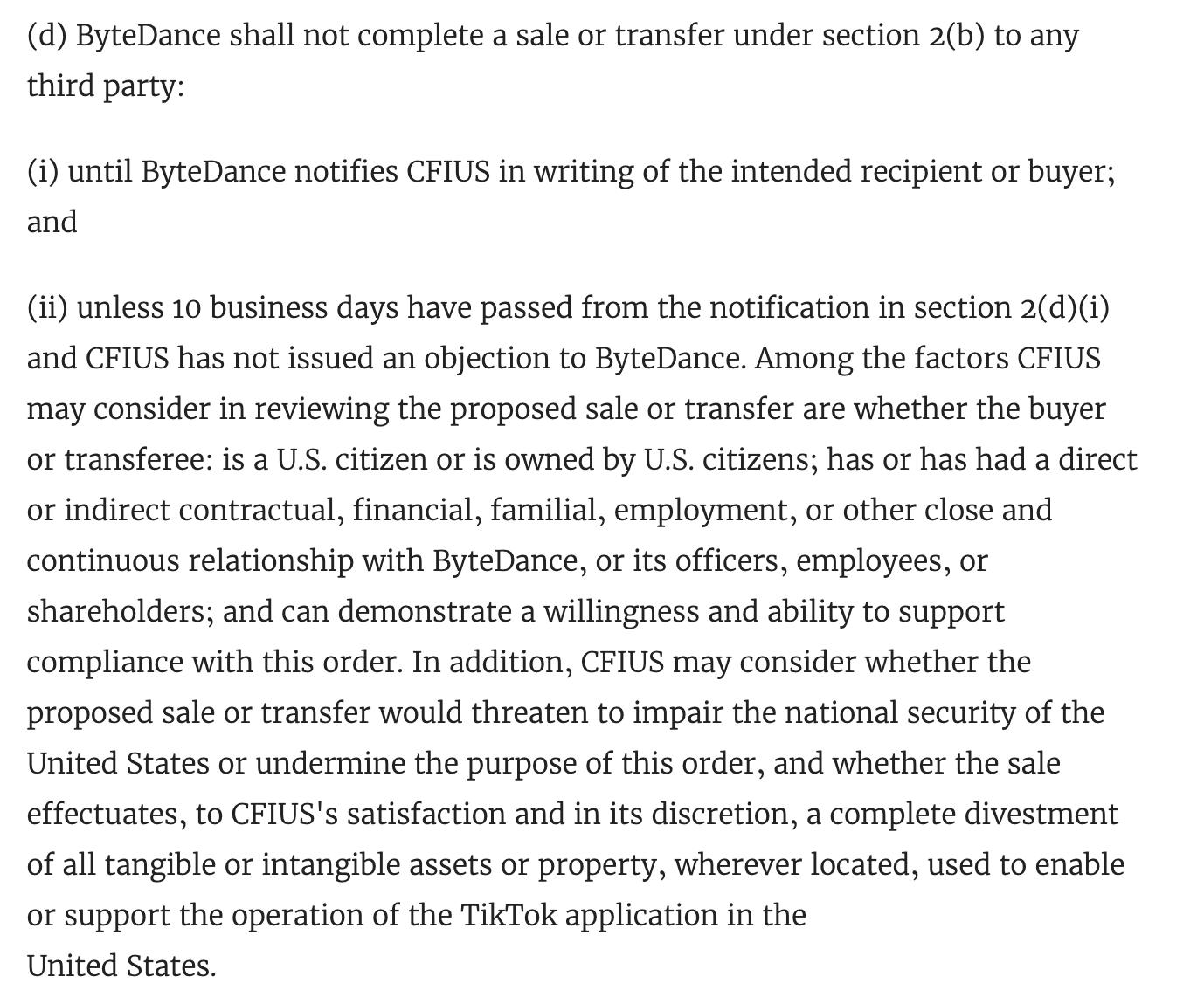 该行政令中还称,字节跳动要在书面通知CFIUS潜在的买主并未在10个工作日内收到反对后,才可以出售资产。TikTok买家必须为美国公民或由美国公民所有,且与ByteDance或其高管、员工或股东不能有直接或间接的合同、财务、家族、雇佣或其他密切联系的关系,并且可以证明愿意并有能力遵守此行政令。