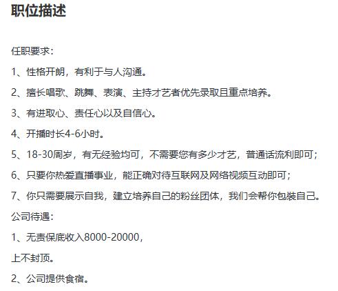 职业要求方面,在某招聘网站上,“性格开朗,善于沟通”,“唱歌跳舞才艺更佳”,“只要你热爱直播事业,能正确对待互联网及网络视频互动即可”等要求被一一写入,看似宽泛,但要都达到,实际又很严格。