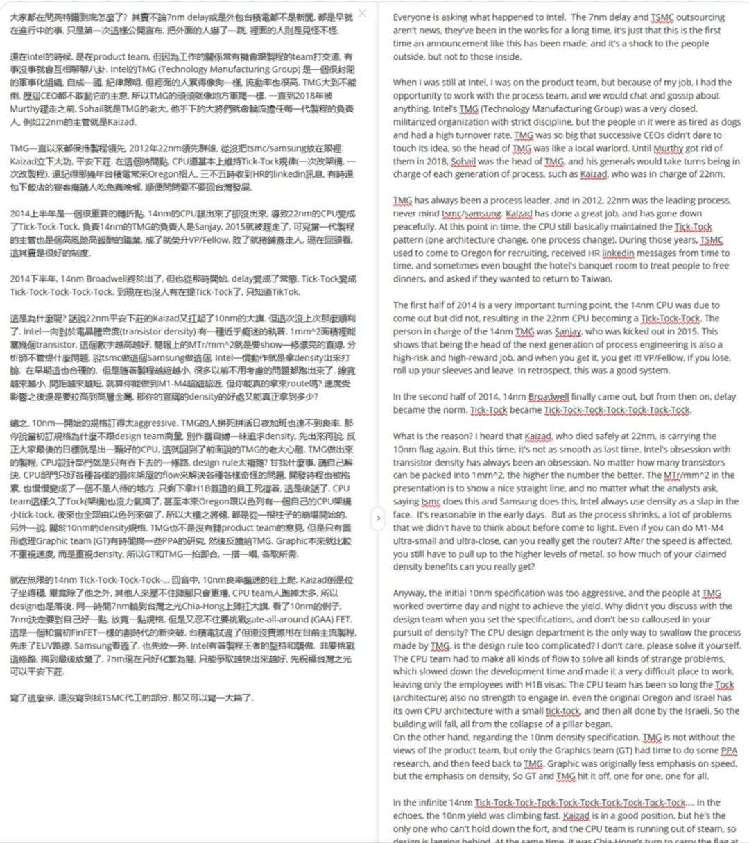 最初的 10 nm 太过激进,TMG 团队需要加班加点。但这并没有真正起到帮助作用,因为 TMG 最终无法在约定的时间框架内实现预期的收益率。对于 CPU 设计部门来说,TMG 的所有设计都显得过于复杂,以至于他们不得不解决各种奇怪的错误。这反过来又导致了研发过程的放缓。因此,工作环境变得越来越恶劣,结果造成更多延误,更多系统性问题,并且已经工作多年的系统看起来似乎即将崩溃。