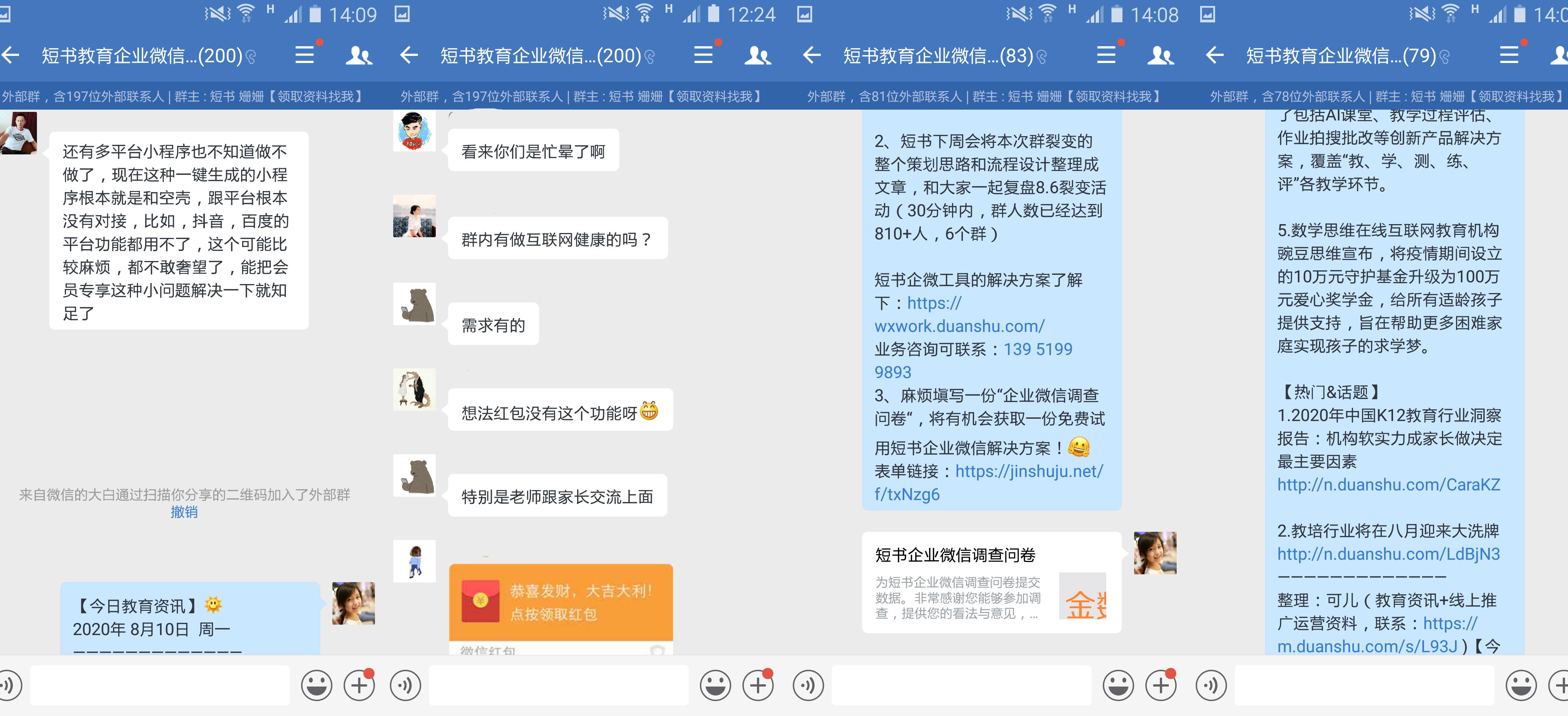 前段时间我们做了一场企业微信的社群活动,社群是为了推广新出的白皮书资料,但是活动刚推出的10分钟,群人数就达到了单个企业微信群的上限200人;15分钟,全部社群的人数就已经突破了800人。