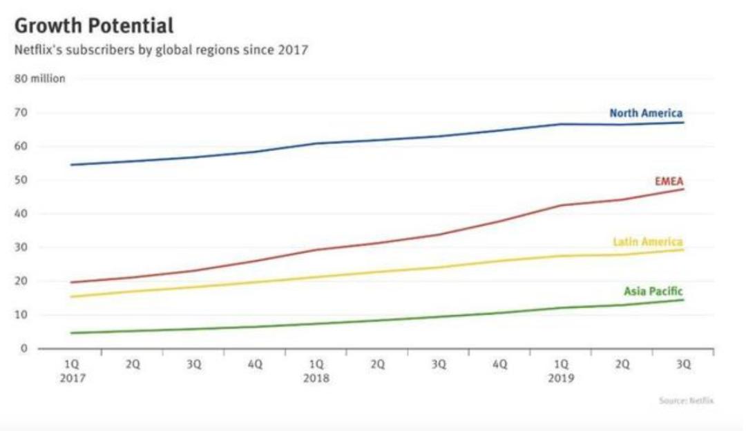 在亚太地区出色的表现已经延续了好几个季度了,增速较快的市场主要是韩国、日本和印度。东南亚仍然处于待开发的处女地。2019年,奈飞在亚太地区的收入在达到15亿美元。因为全球最低价,印度市场的会员增速还是可以的,CompariTech根据Netflix最近发布的官方数据发布了图表,其中提到超过200万印度人正在享受Netflix的内容。