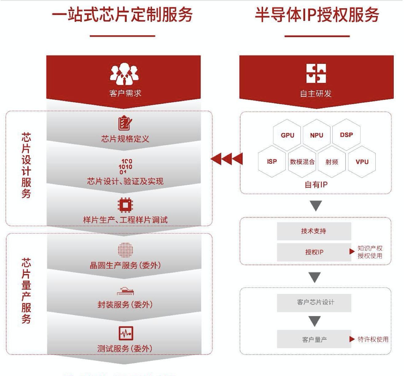 其招股书显示,芯原的主要经营模式为芯片设计平台即服务(Silicon Platform as a Service,SiPaaS®)模式(以下简称“SiPaaS 模式”)。与传统的芯片设计服务公司经营模式不同,芯原自主拥有的各类处理器 IP、 数模混合 IP 和射频 IP 是 SiPaaS 模式的核心。通过对各类 IP 进行工艺节点、面积、带宽、性能和软件等系统级优化,芯原打造出了灵活可复用的芯片设计平台,从而降低客户的设计时间、成本和风险,提高芯原的服务质量和效率,而产品的终端销售则由客户自身负责。
