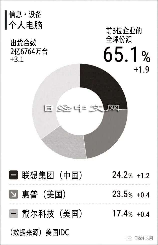 在2019年的个人电脑市场上,中国联想集团的全球份额大幅提升,甩开了2018年并列第一的美国惠普,单独坐上首位宝座。排名前五的企业所占份额逼近全球总体的8成,与2018年相比,垄断进一步加剧。