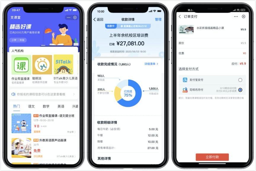 目前,已经吸引了包括学而思网校、新东方在线、作业帮、高途课堂、猿辅导、51Talk、VIPKID、环球网校、樊登读书会、潭州课堂在内的头部十大教培机构入驻支付宝