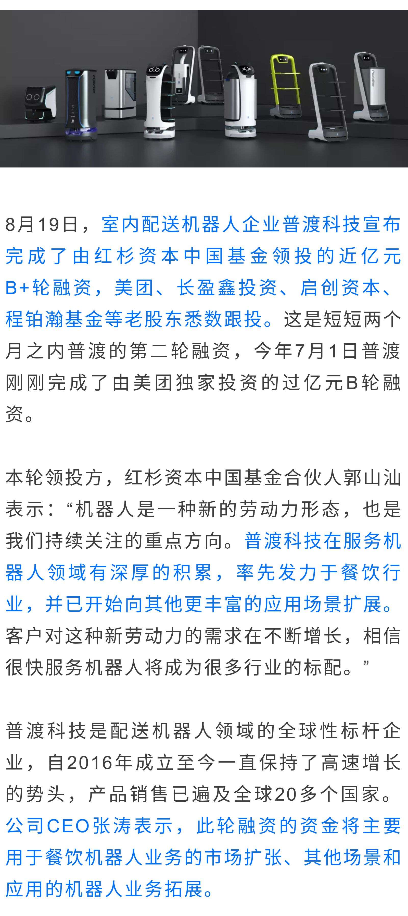 36氪获悉,室内配送机器人企业「普渡科技」于8月19日宣布完成了由红杉资本中国基金领投的近亿元B+轮融资,美团、长盈鑫投资、启创资本、程铂瀚基金等老股东悉数跟投。这是两个月内普渡科技完成的第二轮融资,今年7月1日普渡刚刚完成了由美团独家投资的过亿元B轮融资。