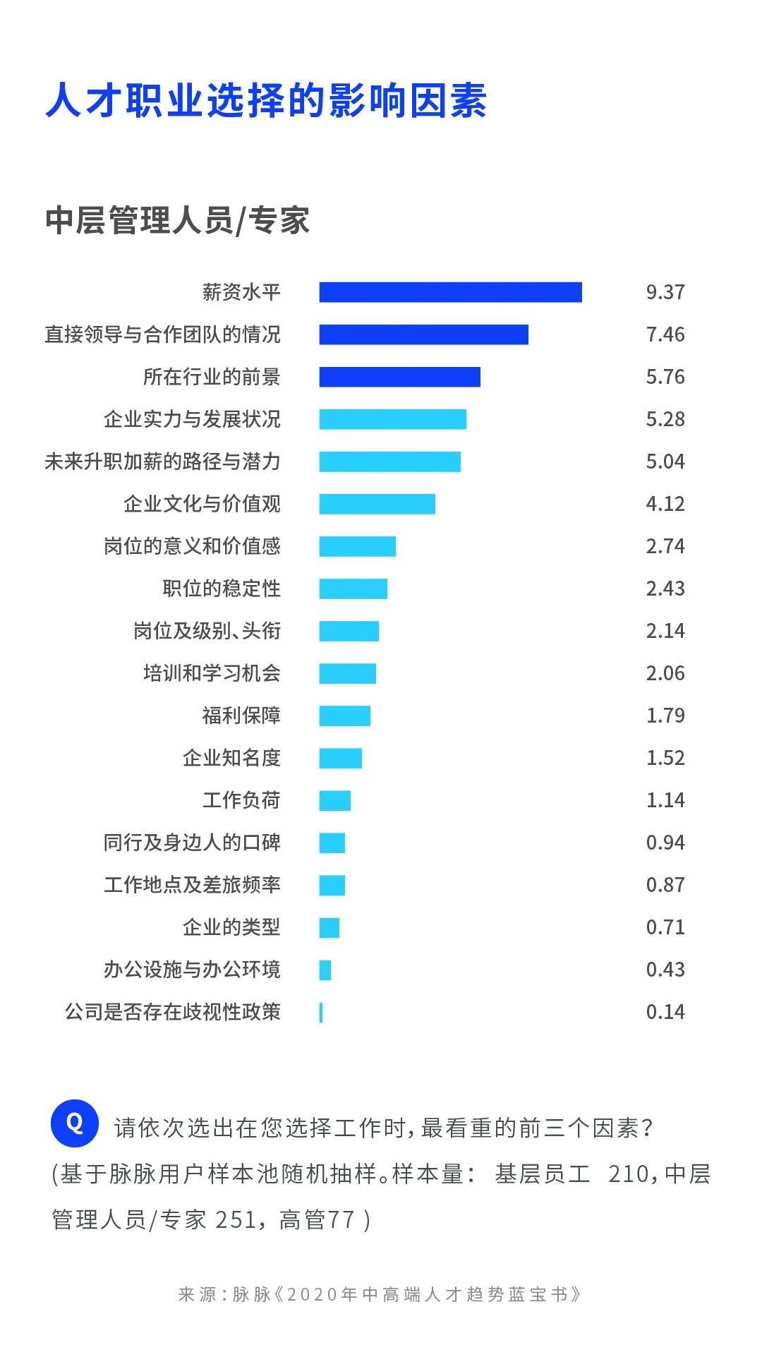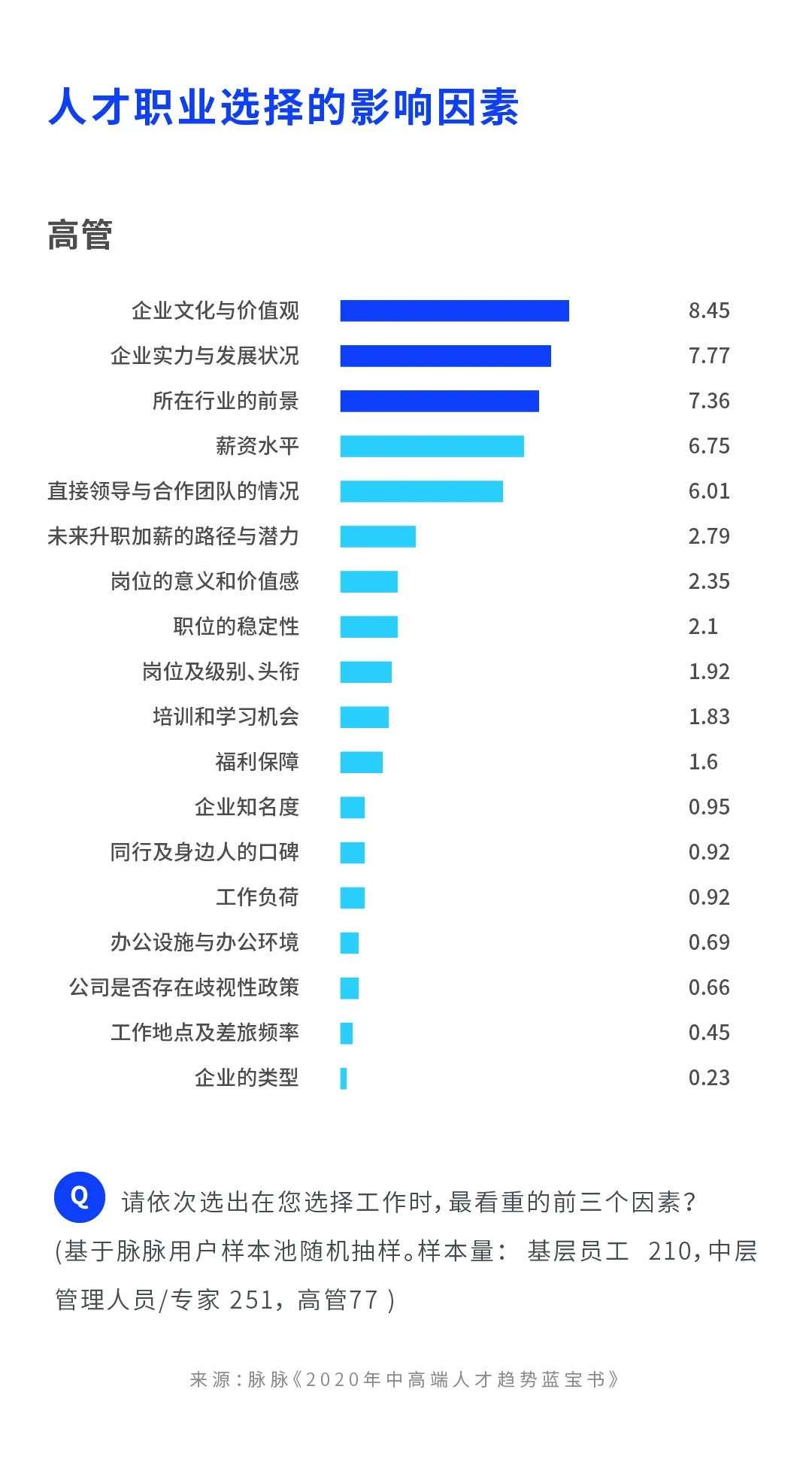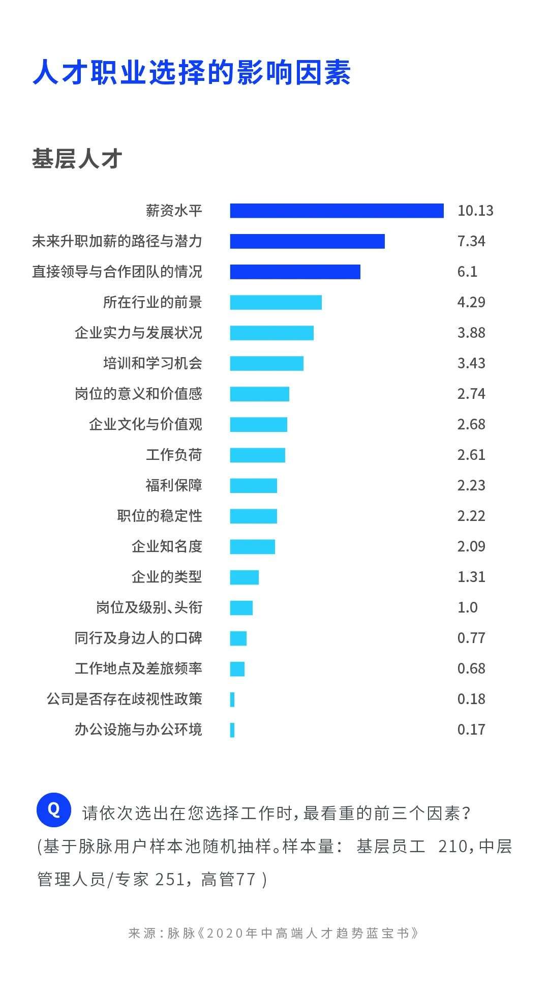 此次在2020年8月进行的人才求职影响因素调研(简称“调研”)基于脉脉用户样本池随机抽样,分别访问了基层员工、中层管理人员/专家及高层管理人员,了解他们选择工作时,最看重的前三个因素。