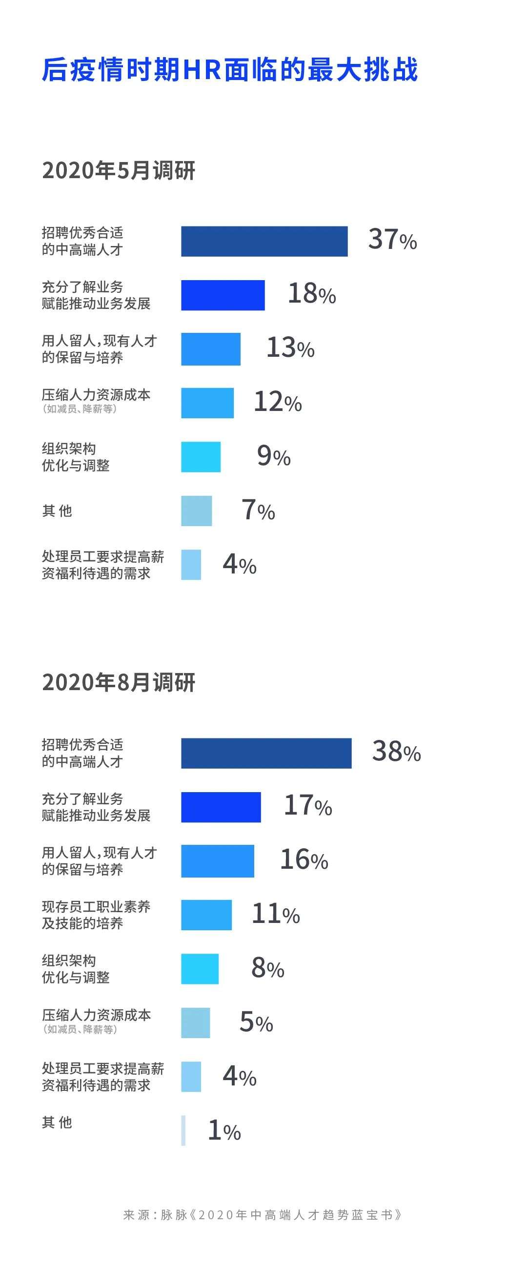 《2020年中高端人才趋势蓝宝书》披露,脉脉数据研究院分别在2020年5月和8月对HR群体进行调研,问其当下工作面临的挑战,“寻找合适的中高端人才”的压力有增无减,一直都是排名第一的答案,远超压缩人力资源成本。