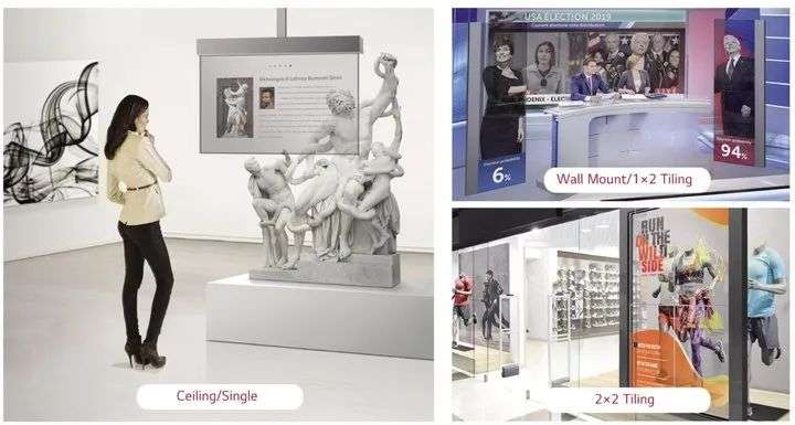 在电视机之外,透明显示屏还可以找到许多应用场景。尤其对 LG 这样的供应方来说,它自己对户外广告牌,或是企业、博物馆内信息展示版等领域的兴趣,也要比电视机本身大得多。