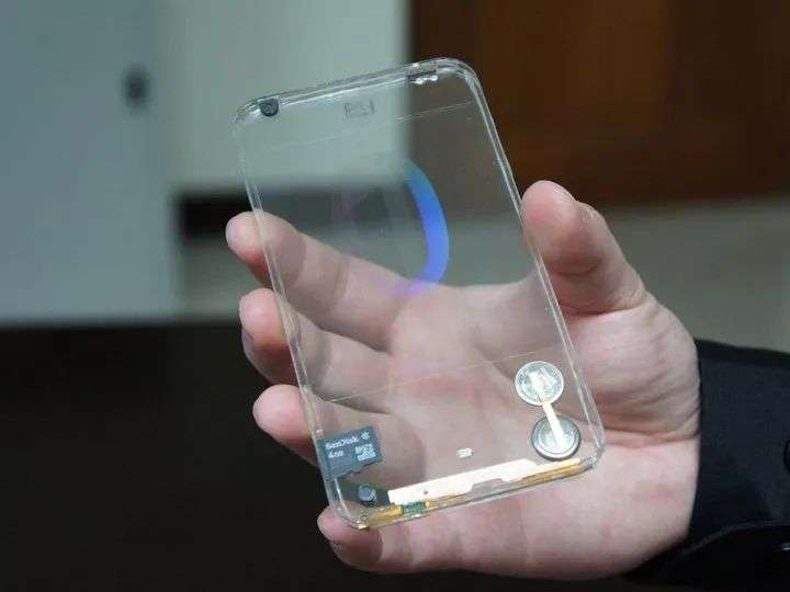 台湾宝创公司制作的透明手机原型,使用了 OLED 屏、纽扣电池及 SD 卡等元件,但屏幕上除了显示 0 和 1 之外就没有其它元素了