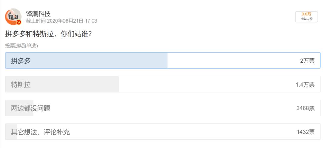 腾讯新闻发起话题“特斯拉拒付拼多多团购”的投票中,69.4%的网友选择直吹拼多多用户,30.6%的网友选择支持特斯拉。而在微博上,也有博主发起了投票,3.9万人参与,其中有2万票支持拼多多,1.4万票支持特斯拉,觉得两边都没问题的有3468票,其他的有1432票。