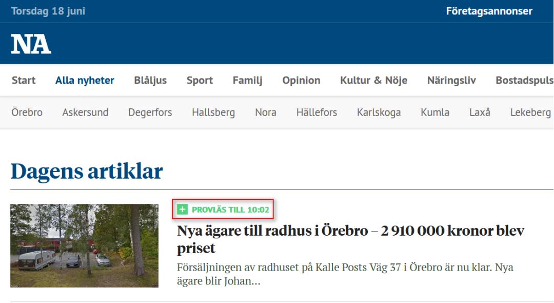据此,他们决定采取的时间墙策略是,文章在发布后首小时免费,使其在读者受付费墙限制之前达到点击量的峰值,并且读者会在页面上看到文章剩余免费时间的倒计时。首小时免费过后,文章被划入付费才可阅读的内容。倒计时的具体视觉设计是,文章标有“provläs till”,意为“测试阅读”,同时附上绿色文本显示的剩余可访问时间。