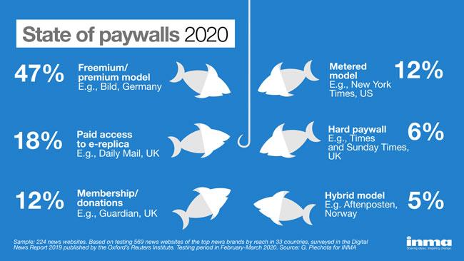各类付费墙比例及代表性媒体,图片来源:INMA。