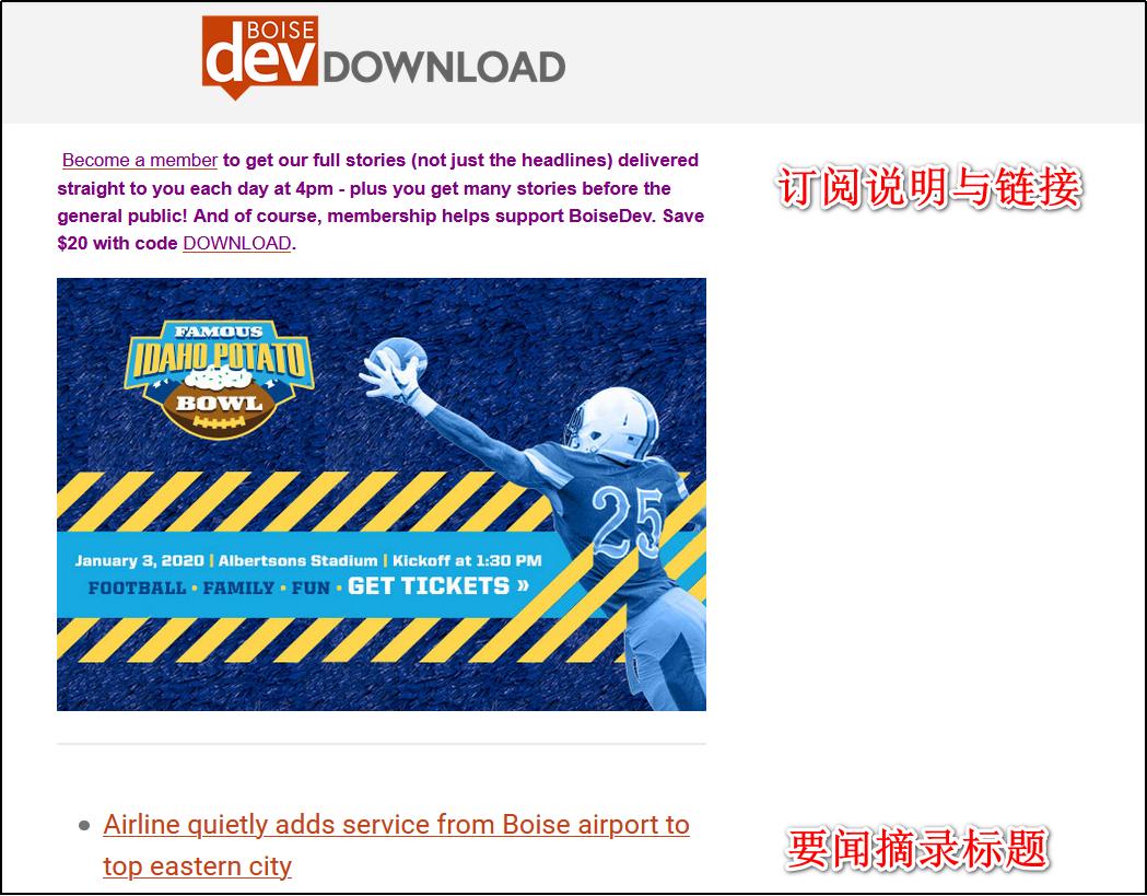 BoiseDev及发行人Don Day所代表的视角,意味着给非付费用户以尊重,以此作为可能的价值交换的前提。在尼曼新闻实验室2020年预测中,Don Day提到了配合时间墙的新闻邮件形式,BoiseDev不会发送纯粹的广告邮件,而是将邮件中附有的新闻内容作为吸引点,非付费用户每周会收到一封本周要闻摘录的邮件(仅有标题),想要提前阅读到全文,则需要购买会员,这一方面可以激励读者再次访问,另一方面可以促进新的订阅转化。相比轰炸式的广告软件,这也会让用户感觉到更受尊重。