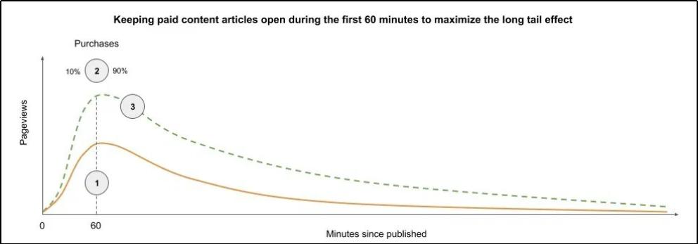 这一研究结果向团队表明,内容付费生意符合长尾商业模型。也就是说,文章的平均页面浏览量会在发布后一小时达到峰值,其间增长曲线也比较陡峭,但从总量来看,文章的多数流量还是会在峰值后的时间内实现。