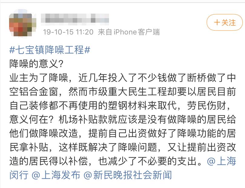 一直以来,飞机噪音就是居住在七宝居民心里的痛,特别是那些建成已久的老旧小区来说,因为当年比较滞后的社区建造,很多小区并没有如现在的新房一样,装上很先进的隔声窗。