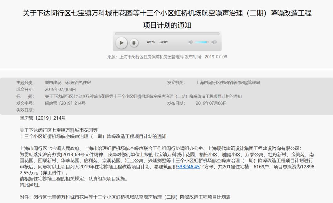 就在去年7月,闵行区住房保障和房屋管理局发布了《关于下达闵行区七宝镇万科城市花园等十三个小区虹桥机场航空噪声治理(二期)降噪改造工程项目计划的通知 》。