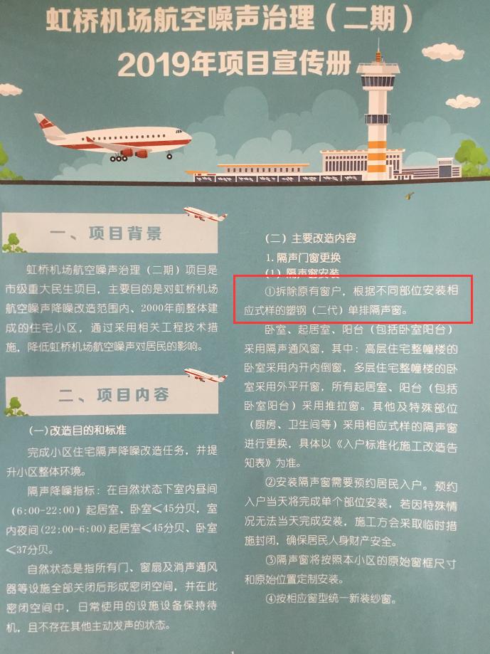 首先,我们看看降噪工程的宣传册,上面写着主要改造内容,拆除原有窗户,根据不同部位安装相应式样的塑钢(二代)单排隔声窗。