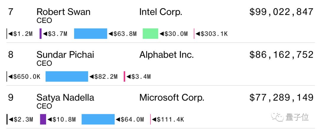 在后5名的榜单中,除了位列第6的黑石集团的首席运营官和第10位的美国制药公司Sarepta TherapeuticsCEO之外,其余都是我们熟悉的科技巨头。