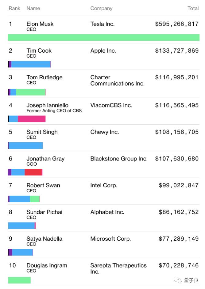 彭博社薪酬指数总结了向美国监管机构提交薪酬细节的公司中薪酬最高的100名高管,可以看到除了马斯克之外的一片绿(即全部是由期权奖励组成)之外,其他高管的薪资都是由各个部分构成。