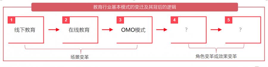 而看向更远的未来,从线下教育到在线教育,再到 OMO 模式,本质上都是场景迁移驱动模式更新。当 OMO 模式成为教育行业的常态后,下一阶段的基本模式将跳出场景迁移的逻辑,转向角色变革(如教师角色的改变)或效果变革(如应试标准的改变)。