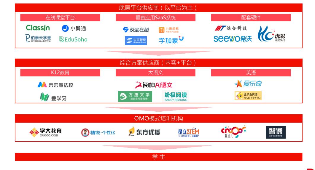 在 To B 为主的技术供应商层面,目前还未有 OMO 完整技术的供应商,但有许多线上教学和管理的产品,能够为线下机构触网提供基础支持,也为 OMO 模式奠定基础。