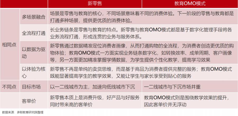 如下图所示,新零售与教育 OMO 模式都涉及多场景融合、全流程打通、以数据为驱动和以体验为核心,二者整体逻辑相同,仅在目标市场、客单价等细节有所差异。