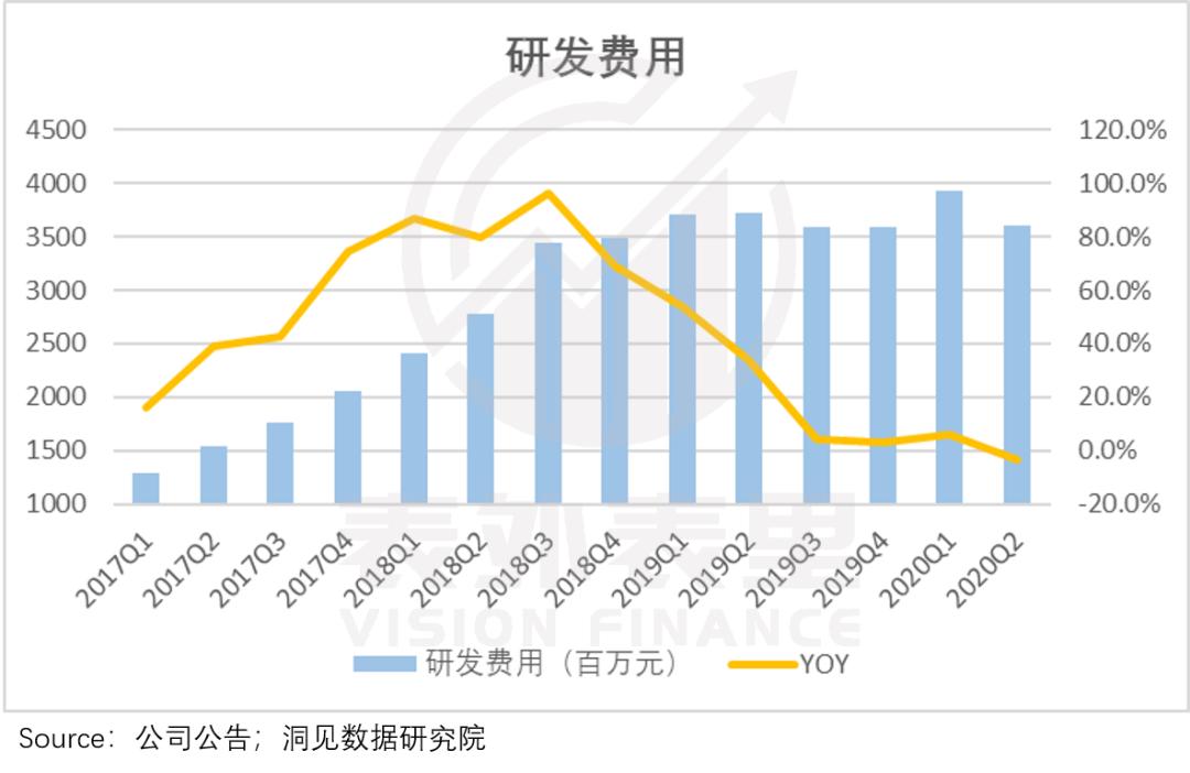 如下图所示,从绝对值来看,京东的研发费用基本在2018Q4之后,7个季度内波动不大。同比数据更是一路下滑,直到2020Q2呈现负增长。