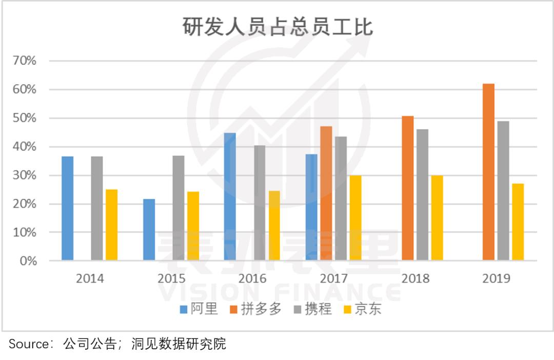 事实证明并不是这样的,同为竞争对手的阿里、拼多多在研发费用的投入上,仍然保持稳定的增长支出。都不算技术公司的携程,不仅保持连年增长的趋势,而且从 14 年开始便从来没用让研发占比跌破 30%。