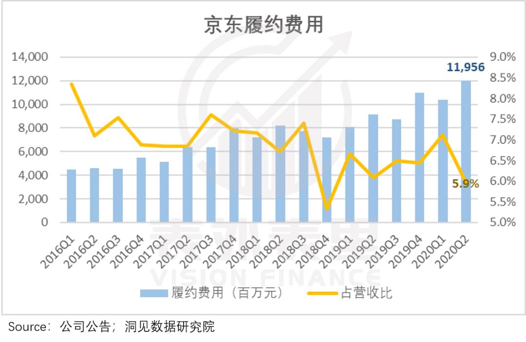 从上图可以看出,2019Q2时,京东每收入100元需要付出6.1元的快递仓储费用,而2020Q2这个数字下降到了5.9元。