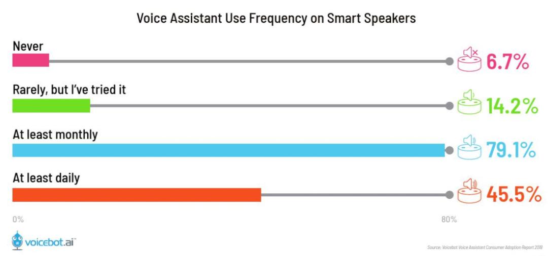 研究机构Voicebot.ai在2018年发布的研究中提到,有79.1%的用户有每个月使用智能音箱的习惯,其中又包括占整体45.5%的用户已经在“日常使用”。[3]连李彦宏也在2019年公开承认:“以智能音箱为代表的智能家居,可以说是AI时代搜索的新入口。”[4]