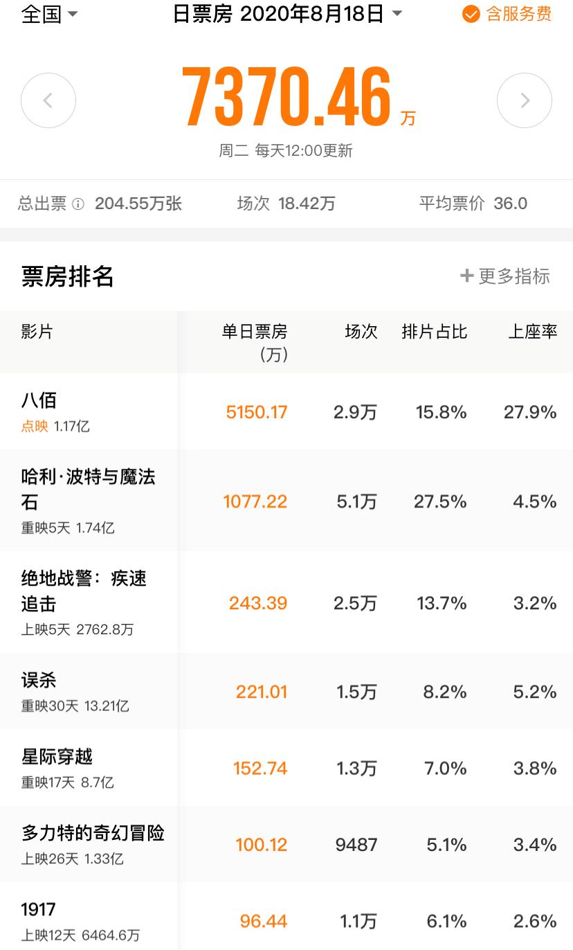 可以预见的是,到本周末《八佰》正式上映后,单日票房将大概率实现复工后的首次破亿。待到《信条》和国庆档多部大片上映后,国内电影市场应该也会逐渐恢复常态,成为全球最先迎来全面复苏的主要市场之一。