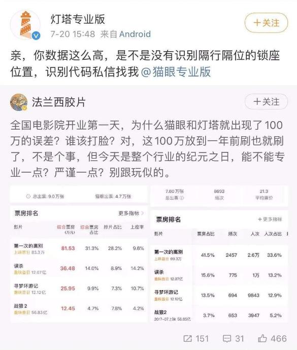 此外在今年电影复工首日,猫眼和灯塔票房数据差了有将近100万。对此,有网友称,两者都是根据售票情况估算的。而灯塔专业版在社交平台@猫眼专业版,并表示,猫眼专业版数据这么高,是不是没有识别隔行隔位的锁座位置,识别代码可以私信找自己。
