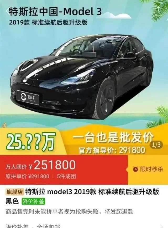 事情源于7月20日,拼多多联合宜买车旗舰店推出“特斯拉中国Model 3 2019款标准续航后驱升级版黑色”万人团购活动,团购价为25.18万元,仅提供5辆车拼团。由于该团购价格比特斯拉官网29.18万元的起售价便宜4万元,因此吸引了很多消费者的关注。