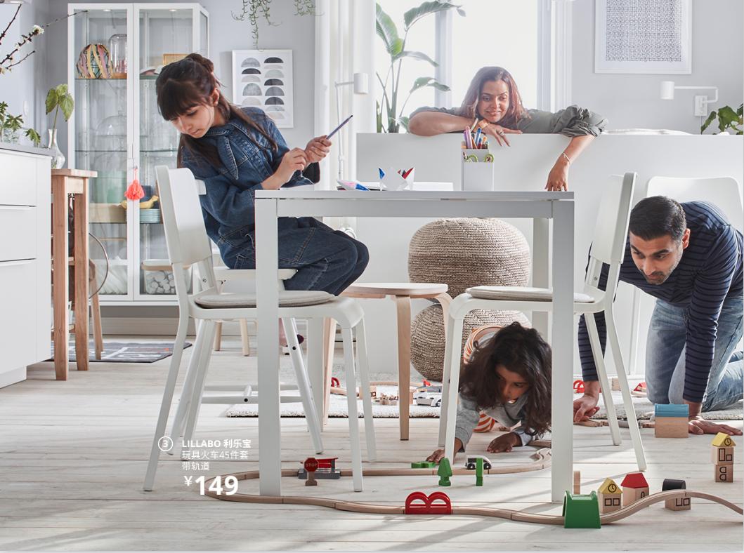 第二个故事则是一个四口之家的新生活,人口数量增加,对于空间的利用率就得加强,同样是强调收纳,还得照顾孩子的贪玩的特性,在这个故事出现的产品除了宜家常见的灯具、厨具等,还有带轨道的玩具火车、LED 小圆烛等玩具。
