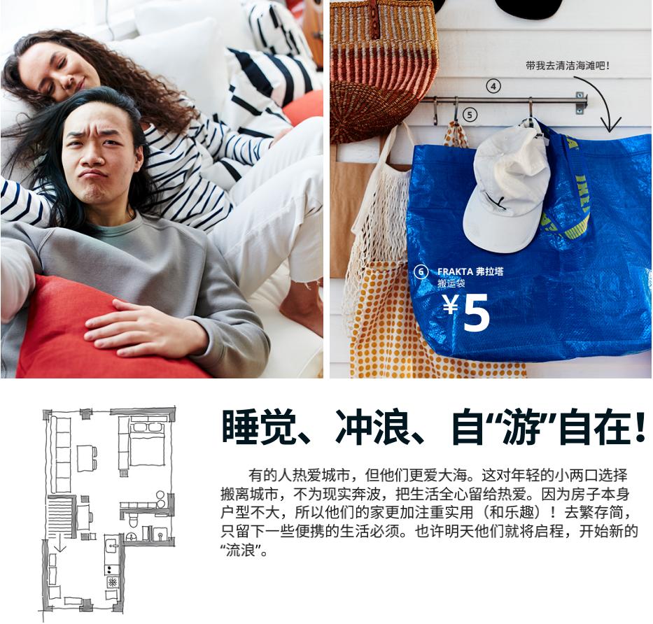 既然是搬家,怎么少得了搬运袋呢,第一个专题故事中就出现了「宜家神器」——弗拉塔搬运袋,这个 5 元钱的袋子在各大社交媒体上频频出现,在众多宜家什么值得买的问题评论区中,弗拉塔搬运袋是出现频率最高的答案之一,便宜质量又好。