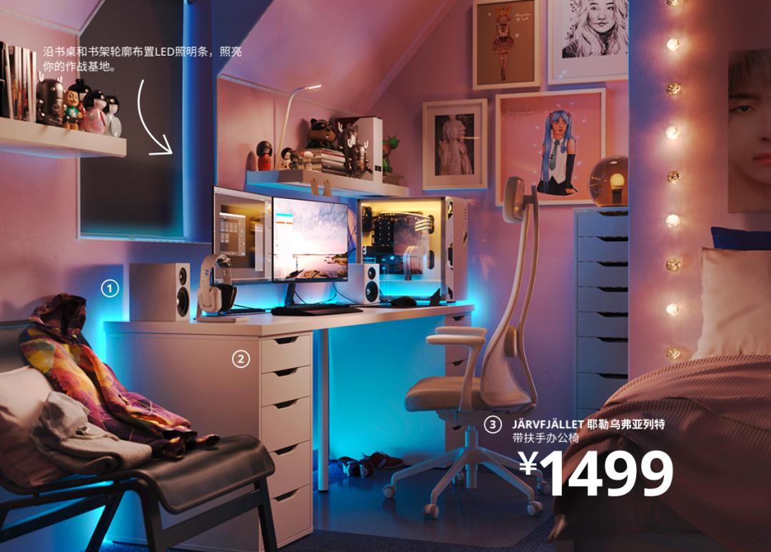 值得一提的是,今年《家居指南》中出现了和游戏相关的家具,在专题「玩」中出现了好几套游戏桌面家居,其中还有不少玩家喜爱的 RGB 灯条,电竞感跃然而出。