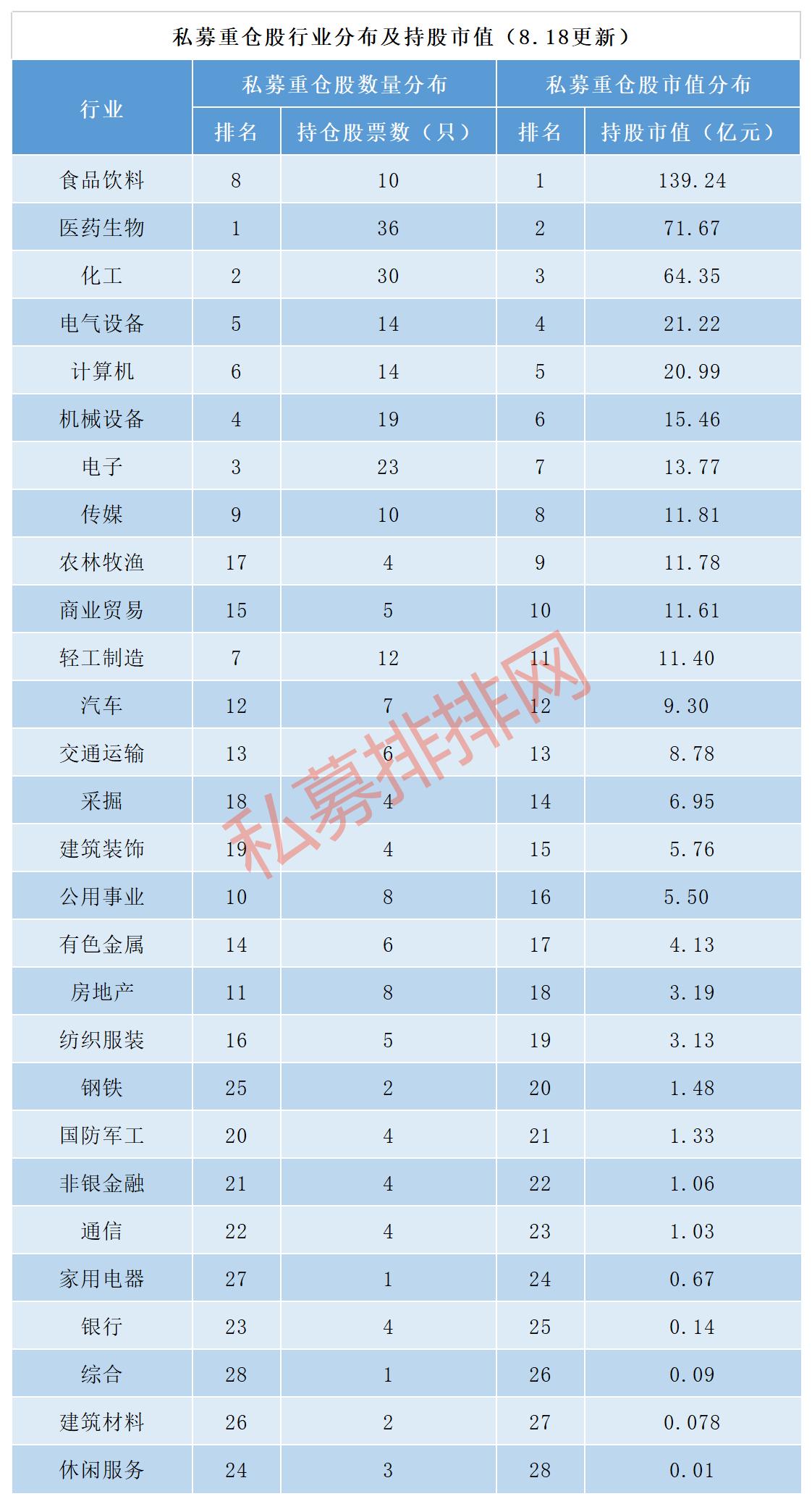 行业方面,据私募排排网数据,截至8月18日批露的中报,私募基金抱团扎推食品饮料、医药生物、化工行业,私募持股市值分别为139.24亿元、71.67亿元、64.35亿元。排名第二第三的医药生物和化工行业分别由36只股票和30只股票被私募机构重仓持有,而排名第一的食品饮料行业仅有10只股票被私募机构重仓,说明该行业市场集中度高、头部效应明显。