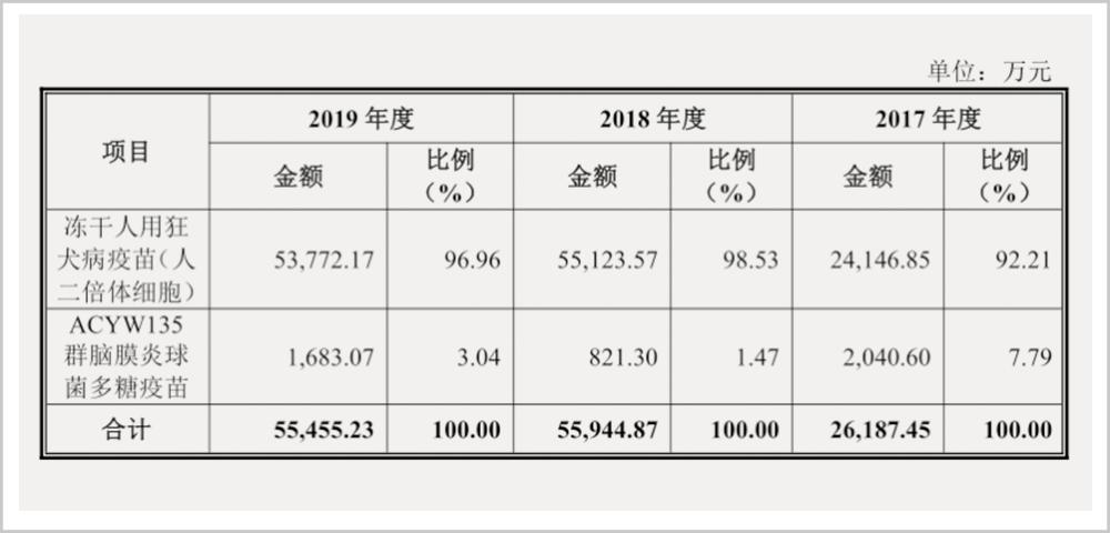 2017-2019年期间,康华冻干人用狂犬疫苗的销售收入分别为2.41亿、5.51亿、5.38亿,分别占同期营收的92%、98.5%、97%。