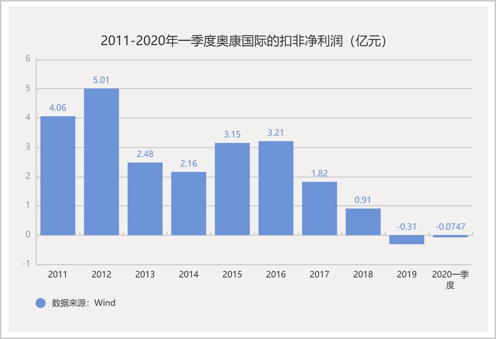 受疫情影响,2020年一季度,奥康国际营收4.39亿元,同比下降40.33%;扣非净利润为-747万元,同比下降110.51%。