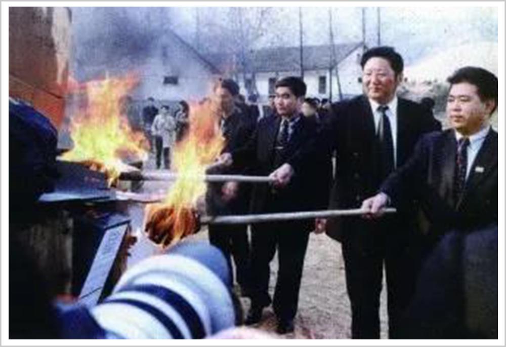 1987年8月8日,在杭州武林门广场上,工商局工作人员一把火,烧毁了5000多双劣质温州鞋。