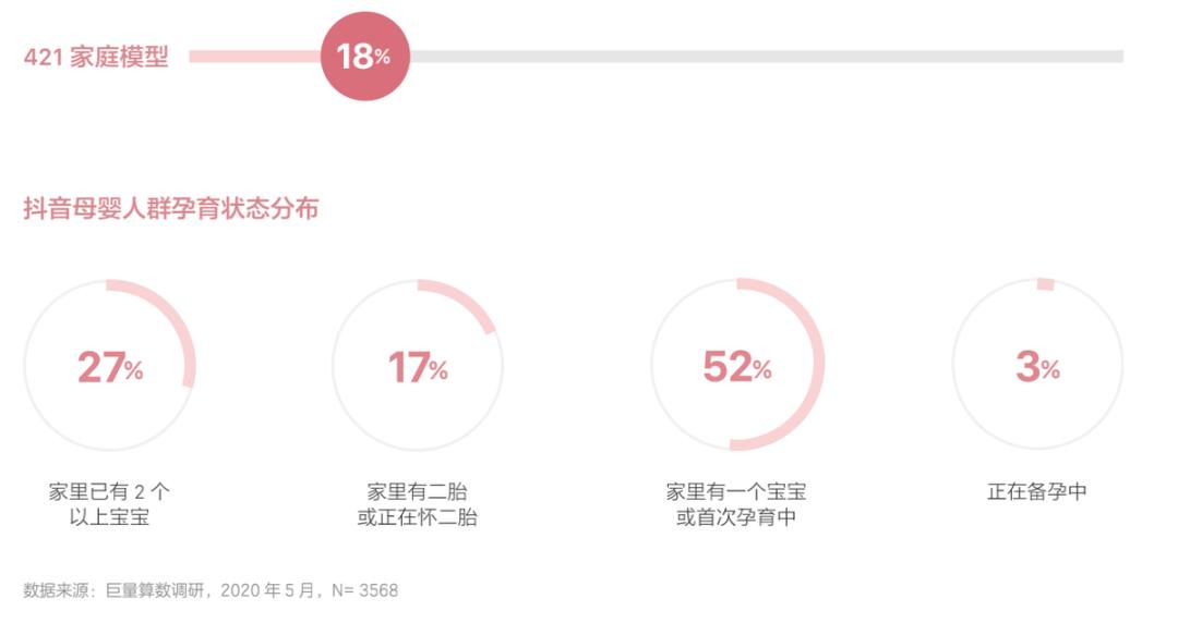 但同时不容小觑的是,从2016年开始实行的二胎政策带来了极长尾的影响。据《2020巨量引擎母婴行业白皮书》数据显示,约44%的抖音母婴人群有二胎、正在怀二胎或已有2 个以上宝宝,从整体数量来看有增长至五成的趋势。